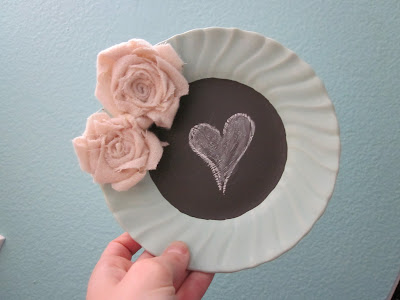 Frist off I made these little fabric flowers with scrap fabric I have collected over the years (I knew it would be good for something one day!) I found these cute little plates and platters at an antique shop up in Slo and painted them with the chalkboard paint. Slap some of those fabric flowers on there and you have yourself a cute little decoration!
